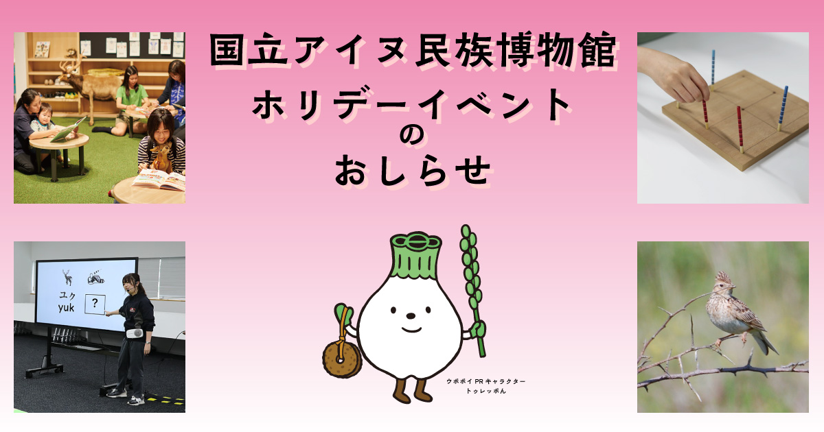 ホリデーイベントは見たり、聞いたり、さわったり、体を動かしたり、モノを作ったりなどなど…アイヌ文化や歴史について楽しく学ぶことのできるイベントです。 詳しくは各イベントのページをご覧ください。